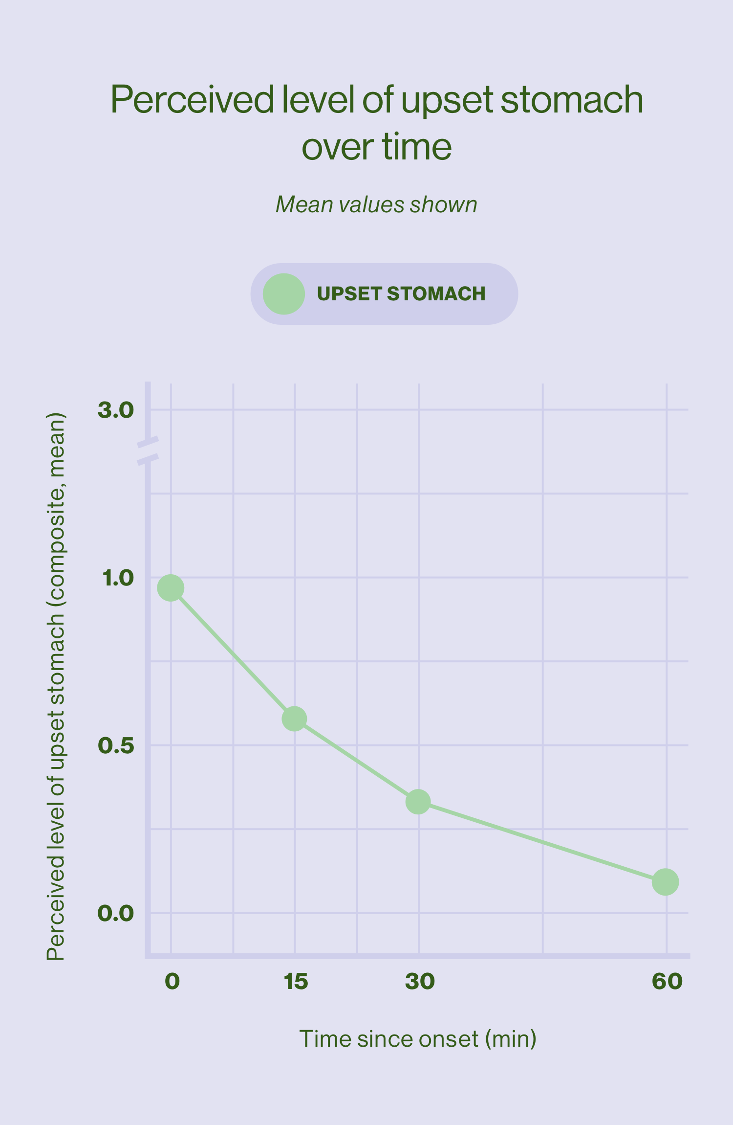 94% of participants saw a decrease in feelings of upset stomach in 30 minutes.*