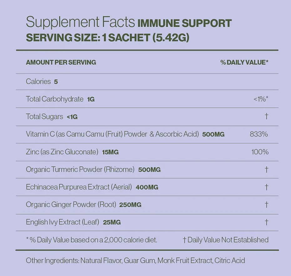 Zinc, Vitamin C, Echinacea, Ginger, Turmeric, Ivy Leaf Extract.